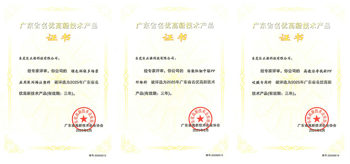 近日,广东省高新技术企业协会公布了2025年第一批广东省名优高新技术产品名单。东莞巨正源科技有限公司的“绿色环保多场景应用聚丙烯注塑料”、“纺能恒韧中熔PP纤维料”、“高透洁净低析PP吹膜专用料”三项产品凭借卓越的产品品质、创新的产品技术和领先的市场地位,荣获“广东省名优高新技术产品”称号。
